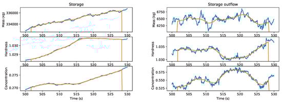 Evolution of the storage average properties over time (left) and the predicted feed for the next 30 s (right) given the funnel flow zone in Figure 13. A 2 s moving average is included (orange).