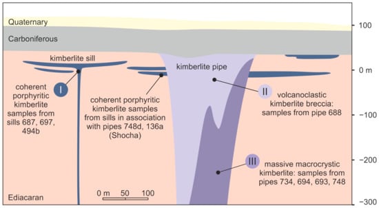- Tretyachenko, V.V.V.; Garanin, V.K.; Bovkun, A.V.; Garanin, K.V.K.V. Formational typification of early-hercynian volcanic complexes in Archangelsk kimberlite-picrite province. In Proceedings of the Alkaline Magmatism of the Earth and Related Strategic Metal Deposits, Proceedings of XXXII International Conference, Moscow, Russia, 7–14 August 2015; Kogarko, L.N., Ed.; GEOKHI RAS: Moscow, Russia, 2015; pp. 133–135. [Google Scholar]