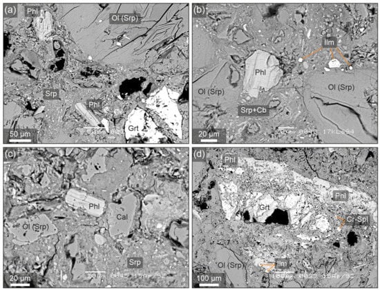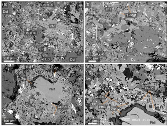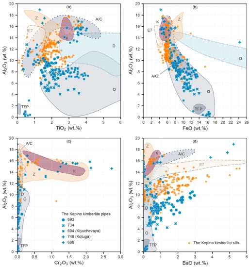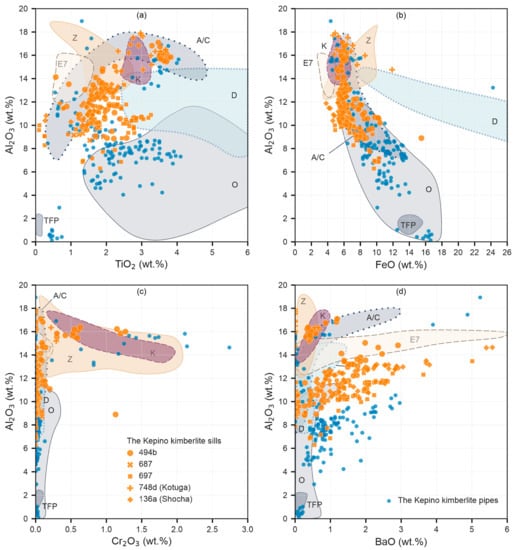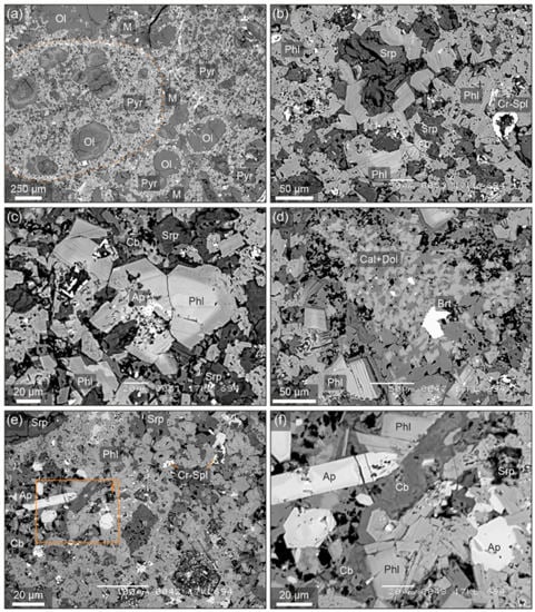- Kargin, A.V.; Sazonova, L.V.; Nosova, A.A.; Lebedeva, N.M.; Kostitsyn, Y.A.; Kovalchuk, E.V.; Tretyachenko, V.V.; Tikhomirova, Y.S. Phlogopite in mantle xenoliths and kimberlite from the Grib pipe, Arkhangelsk province, Russia: Evidence for multi-stage mantle metasomatism and origin of phlogopite in kimberlite. Geosci. Front. 2019, 10, 1941–1959. [Google Scholar] [CrossRef]