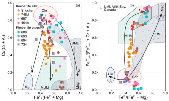 - Roeder, P.L.; Schulze, D.J. Crystallization of groundmass spinel in Kimberlite. J. Petrol. 2008, 49, 1473–1495. [Google Scholar] [CrossRef]