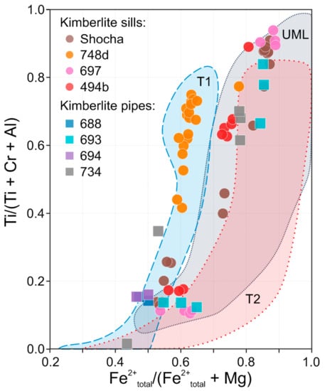 - Golubkova, A.B.; Nosova, A.A.; Larionova, Y.O. Mg-ilmenite megacrysts from the Arkhangelsk kimberlites, Russia: Genesis and interaction with kimberlite melt and postkimberlite fluid. Geochem. Int. 2013, 51, 353–381. [Google Scholar] [CrossRef]