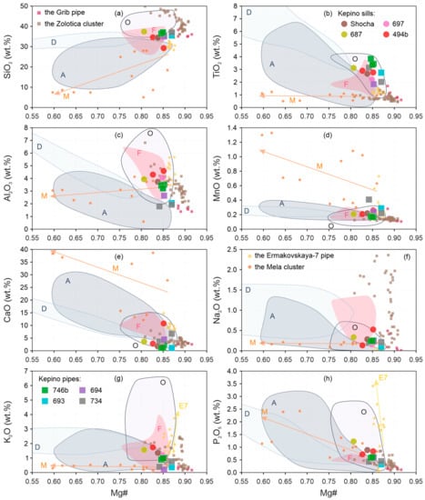 Kargin, A.V.; Nosova, A.A.; Sazonova, L.V.; Tretyachenko, V.V.; Larionova, Y.O.; Kovalchuk, E.V. Ultramafic Alkaline Rocks of Kepino Cluster, Arkhangelsk, Russia: Different Evolution of Kimberlite Melts in Sills and Pipes. Minerals 2021, 11, 540. https://doi.org/10.3390/min11050540