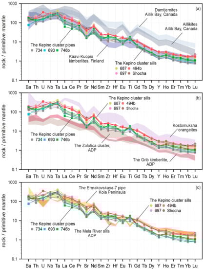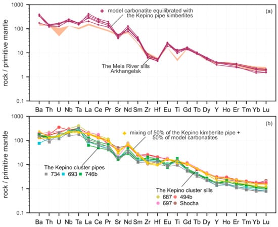 - Kargin, A.V.; Nosova, A.A.; Postnikov, A.V.; Chugaev, A.V.; Postnikova, O.V.; Popova, L.P.; Poshibaev, V.V.; Sazonova, L.V.; Dokuchaev, A.Y.; Smirnova, M.D. Devonian ultramafic lamprophyre in the Irkineeva–Chadobets trough in the southwest of the Siberian Platform: Age, composition, and implications for diamond potential prediction. Geol. Ore Depos. 2016, 58, 383–403. [Google Scholar] [CrossRef]