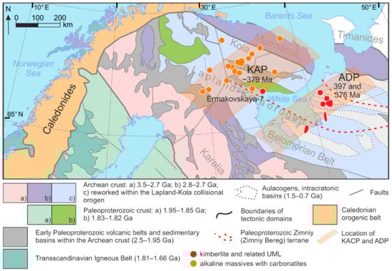 - Bogatikov, O.A.; Garanin, V.K.; Kononova, V.A.; Kudryavceva, G.P.; Vasilieva, E.R.; Verzhak, V.; Verichev, E.M.; Parsadanyan, K.S.; Posuhova, T.V. Arkhangelsk Diamond Province; Bogatikov, O.A., Ed.; MSU: Moscow, Russia, 1999; ISBN 5-211-02558-X. (In Russian) [Google Scholar]