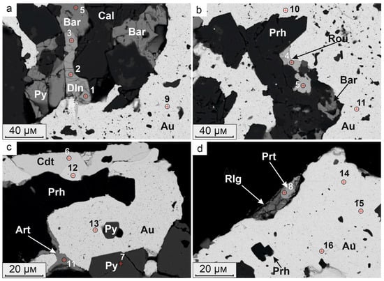 BSE-photo of the minerals intergrown with gold from realgar-orpiment cement breccia. Analyses corresponding to 1–8 point numbers are given in Table 2; the analyses of native gold No. 9–16 are given in Table 3. (a) Polymineral inclusions, consisting of calcite (Cal), barite (Bar), pyrite (Py) and dalnegroite (Dln); (b) polymineral inclusions formed by prehnite (Prh), barite and routhierite (Rou); (c) coloradoite (Cdt) and arsenolite (Art) intergrown with gold; (d) parapierrotite (Prt), realgar (Rlg) and prehnite crystals in native gold.