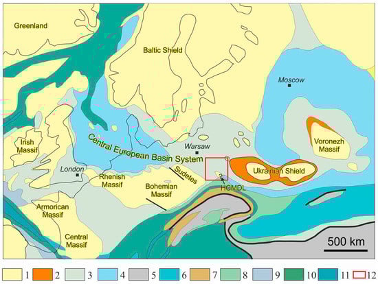 Albian palaeogeography of epicontinental sea and adjacent western Tethys of Europe with simplified distribution of facies (modified from [5,20]); 1—land areas; 2—deltaic, coastal, and shallow marine clastic facies (sands and conglomerates, sands and shales); 3—shallow-marine facies (sands, marls, carbonate marls, marly carbonates, carbonates); 4—mainly shallow-carbonate marine facies (marly carbonates, carbonates, chalk, white chalk, carbonate shales); 5—active fold belts, high relief; 6—marine carbonates; 7—deeper marine clastics (sand and shales); 8—deeper marine carbonates (with sands and shales); 9—carbonates and sands; 10—deeper marine facies (sands and shales, shales); 11—deeper marine shale facies from a rift area; 12—area of the study; HCMDL—hypothetic Holy Cross Mountains—Dobruja Land; ?—no precise data for the southern edge of the HCMDL.