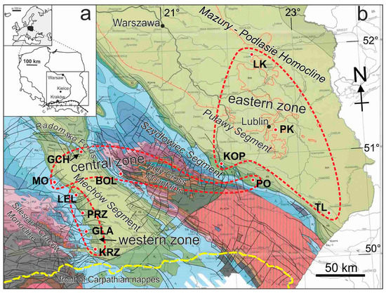 Geological map of the south-eastern part of Poland. (a) Location of study area in Poland and Europe; (b) geological map after [40] with standard stratigraphic colours used: green—Cretaceous; blue—Jurassic; violet–pink—Triassic; other colours—pre-Mesozoic. Red dots indicate sample localities; the western zone: KRZ—Korzkiew, GLA—Glanów-Stroniczki, PRZ—Przychdy, LEL—Lelów; the central zone: MO—Mokrzesz, GCH—Chełmo Mount, BOL—Bolmin, PO—Potok IG-1; the eastern zone): TL—Tomaszów Lubeski IG-1, PK—Piaski IG-2, KOP—Kopiec, LK—Łuków IG-1. Yellow dotted line shows front of the Carpathian nappes. The division of the study area into individual zones was made on the basis of the results of rutile mineralogical studies, which allowed to distinguish three distinct groups (western, eastern, and central) of rutile grains crystallizing at different temperatures (more detailed description in the text).