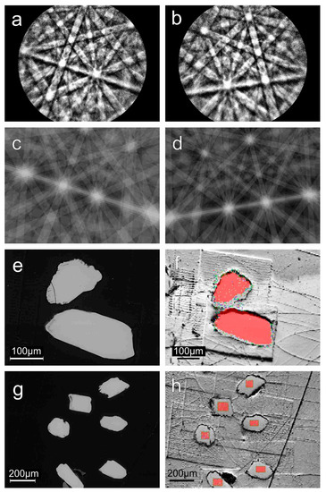 Results of electron backscattered diffraction analysis (EBSD) study of selected rutile grains. (a,b) Experimental EBSD Kikuchi patterns of rutile grains GLA-23 (a) and GLA-24 (b); (c,d) simulated Kikuchi pattern of the same rutile grains GLA-23 (c) and GLA-24 (d); (e) BSE (backscattered electron) image of rutile grains GLA 23 (top) and GLA-24 (bottom); (f) FSE (forescattered secondary electron) image of rutile grains GLA-23 and GLA-24 superimposed on EBSD mapping: red—rutile, single blue pixels*—anatase, single green pixels*—brookite; (g) BSE image of six more rutile grains MO-9—MO-14, (h) FSE (forescattered secondary electron) image of rutile grains MO-9—MO-14 superimposed on EBSD mapping: red—rutile, single blue pixels*—anatase, single green pixels*—brookite; *—single pixels of apparent anatase and brookite phase are most likely just a misidentification of the Bruker esprit software, Bruker Nano GmbH, Berlin, Germany used in EBSD study.