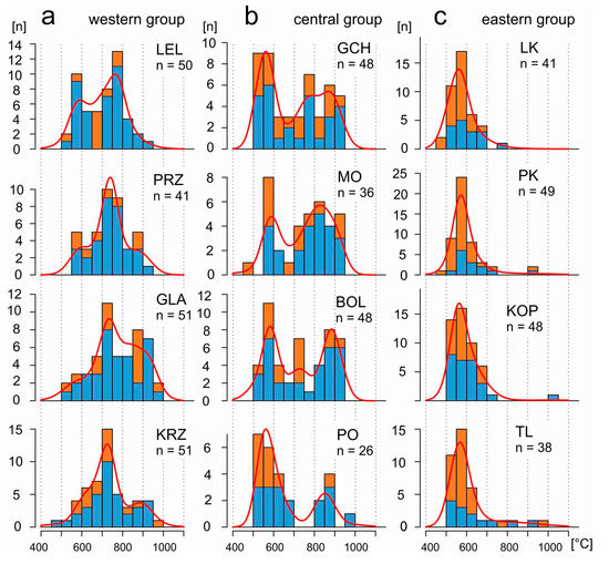 Histograms of rutile crystallization temperatures for all samples in the three groups: western (a), central (b), and eastern (c). Details of sample abbreviation and localization in Table 1. Temperatures were calculated using the [32] formula. Blue colour—metapelitic rutile; orange colour—metamafic rutile.