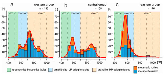 Summary histograms of rutile crystallization temperatures for the western (a), central (b), and eastern (c) groups with an indication of metamorphic facies. Temperatures were calculated using the Watson et al. [32] geothermometer.