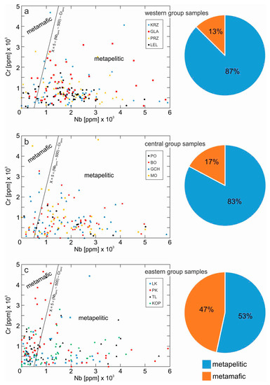 Cr-Nb plots showing contrasting rutile provenance and pie charts of relative abundance of metamafic and metapelitic rutiles in the distinguished western (a), central (b), and eastern (c) groups. Discrimination of metamafic and metapelitic rutile is based on [47]. Details of sample abbreviations and localization are provided in Table 1.