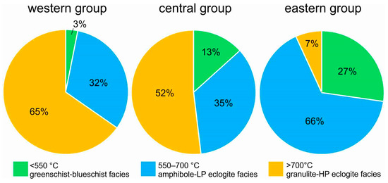 Pie chart of relative abundances of rutiles from different metamorphic facies in the western, central, and eastern groups.