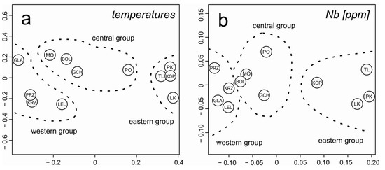 A multidimensional scaling (MDS) statistical analysis was used to compare the similarities between the samples. The MDS is a technique that compares large datasets of a variable, e.g., temperature, element concentration, detrital age, and so on [82]. The result of this method is a configuration of points in the two-dimensional Euclidean plane, creating some sort of a map in which samples with similar analyzed variable values tend to cluster close to each other, while samples with greater dissimilarities plot further apart [83,84,85,86]. It is worth noting that the MDS diagrams of calculated rutile crystallization temperatures and Nb concentrations visualizing the level of similarity between samples confirm quite well the division into three groups adopted by us based on the ZIR method (Figure 9). The four localities of the eastern zone (samples TL, PK, LK, and KOP) on the MDS diagrams are very close to each other, which indicates a high statistical similarity between those samples. The three samples from the central zone (MO, BOL, and GCH) are also located together on the temperature MDS diagram (Figure 9a), which confirms their statistical similarity. One sample, PO, is located between the TL, PK, LK, KOP and MO, BOL, GCH sample groups. Geographically, the PO sample is close to the eastern zone; however, temperature data allow us to include that sample in the central zone (Figure 5). The four samples from the western zone (GLA, PRZ, LEL, and KRZ) are close to each other on the temperature MDS diagram, reinforcing their inclusion in the same, western group. Similar conclusions can be derived from the MDS diagram of Nb concentrations (Figure 9b). As in the temperature MDS diagram, the eastern group is clearly distinct from the rest of the samples. However, the samples of the central group are not as clearly separated from the western group as shown in the temperature MDS diagram. Nonetheless, a faint division between these two groups can still be distinguished.