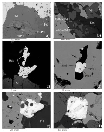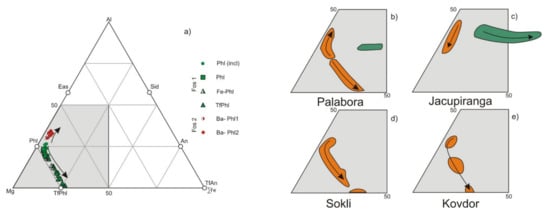 - Lee, M.J.; Garcia, D.; Moutte, J.; Lee, J.I. Phlogopite and tetraferriphlogopite from phoscorite and carbonatite associations in the Sokli massif, Northern Finland. Geosci. J. 2003, 7, 9–20. [Google Scholar] [CrossRef]