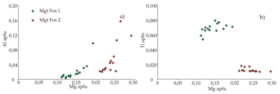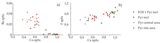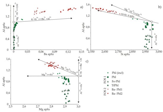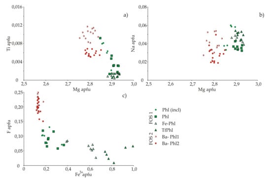 - A phlogopite, enriched in Ba and Al (through substitution by the mechanisms described in Section 4.2), found in FOS 2. In addition, these micas are enriched in Ti and F relative to Type 1 and 2 micas.