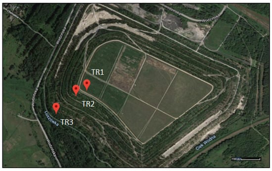 Location of profiles TR1, TR2, TR3 on the mine tailing disposal site of the abandoned mine of Zn and Pb ores “Trzebionka” in Trzebinia (www.google.pl/maps, accessed on 12 April 2021).