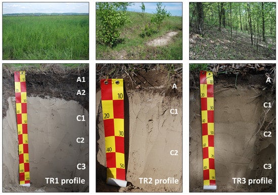 The analyses were carried out on sixteen soil samples from three soil profiles (Figure 1, Table 1) representing the upper part of the disposal site and its slopes. Profile TR1 was located on the top (a plateau) of the disposal site, profile TR2 in the upper part of the slope, and profile TR3 in the lower part of the slope. Profile TR1 was reclaimed by covering the tailings with sandy loamy material rich in soil organic matter (SOM) with a thickness of 25 cm. In profiles TR2 and TR3, soil material present in the A (humus) horizon was probably deposited during reclamation, washed away from the top of the landfill and partly originated due to the accumulation and humification of plant residues. All soils were bipartite formations: the subsoil (C horizons) was built of tailings and the topsoil (A horizons) was comprised of a material deposited on a disposal site during reclamation. Soil profiles were described during field works according to the guidelines for soil description [65]. The field studies were conducted in May 2015.