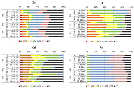 Chemical forms of Zn, Pb, Cd and As in the studied soils. Explanation of chemical forms of elements: F1—exchangeable (i.e., unspecifically adsorbed) elements, as well as easily soluble elements in organometallic complexes; F2—specifically adsorbed and near-surface occluded elements, elements bound to CaCO3, as well as elements in organometallic complexes of low bond strength; F3—elements bound to manganese oxides; F4—elements bound to organic matter; F5—elements bound to amorphous or poorly crystalline iron oxyhydroxides; F6—elements bound to crystalline iron oxyhydroxides; F7—elements in residual fraction.
