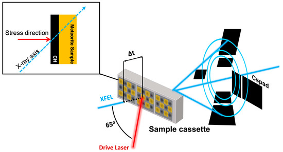 High-pressure dynamic compression experiments represent a unique way to recreate dynamic processes such as asteroid/planetary collisions in the lab and make it possible to track the lattice-level response of materials using in situ time-resolved X-ray diffraction [21,22]. Dynamic compression techniques also provide access to combined high-pressure and high-temperature states of a material in concert with characterization via ultrafast X-ray probes that more traditional static compression techniques cannot access, e.g., [23]. Coupling the laser-induced shock compression experiments with reliable structural studies to elucidate phase transitions that occur at short timescales of hundreds of picoseconds to nanoseconds requires an ultrafast and tunable X-ray source such as X-ray free-electron lasers (XFELs) that can operate on femtosecond timescales with a high repetition rate, e.g., [24,25,26].