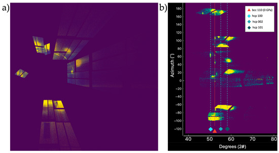 Representative raw X-ray diffraction data for a sample shocked to 42 GPa. (a) 2D diffraction image from CSPADs projected onto a single plane. (b) Caked pattern of (a) displayed as an s function of the 2 and azimuthal angle. The blue diamonds and dashed lines show the hcp peaks for the shock-compressed high-pressure phase. The red line and triangle indicate uncompressed starting bcc Fe. The large spots and uneven intensity distribution indicate the sample is coarse-grained and highly textured.