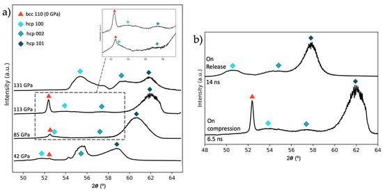 Integrated XRD patterns at 6.9 keV. The blue diamonds show hcp peak locations: light blue, mid-tone blue, and dark blue indicate hcp (100), hcp (002), and hcp (101) peaks, respectively. The red diamonds show the unshocked bcc (110) peak from the starting material at ambient pressure. (a) Pressure series for separate runs collected at full compression. Inset: zoomed-in 2 region to illustrate a weak S/N of the hcp (100) and (200) peaks at 85 and 113 GPa, relative to the more intense (101) peak. (b) Representative time series showing XRD data collected for the same incident laser intensity, generating a 113 GPa peak pressure, but different XFEL time delays: at nearly full compression (bottom trace) and on release (top trace) at ~25 GPa.
