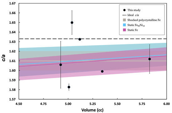 Results from this work were compared with previous data within the same temperature range as this study (1000–3000 K). Our c/a data show a large distribution as a function of volume, with some values near previous work, e.g., [17] or near the ideal 1.63 and even above or below previous trends by as much as 3% (Figure 5). Though the data distribution from all previous static experiments falls below the ideal c/a ratio, we present the first experimental observation of a high c/a, at 1.65, which is even higher than previous ratios determined during shock compression on polycrystalline Fe. This suggests that the requirements for achieving a higher than ideal c/a ratio include starting with an oriented single crystal or highly textured polycrystalline bcc sample and using dynamic compression to transform the bcc to the hcp phase. Though the starting orientation of the exsolution lamellae remained constant shot to shot, meaning the long edge of the lamellae was always placed parallel to the top of the sample holder, specific control of intra-grain orientation for these natural large-grained samples was not possible. This could explain the wide distribution in the c/a values for the Gibeon meteorite—some crystals may have been oriented with the bcc [100] parallel to the shock propagation direction, as in Run, reaching c/a = 1.65, whereas other samples may have had grains oriented along the body diagonal or at high angles from the [100] direction. Recent work [51] systematically tracked the starting orientation in single-crystal Fe during laser-driven shock compression, notably documenting higher than ideal c/a ratios as well. Continued effort in this area is needed to potentially reveal how crystalline orientation trends support proposed deformation mechanisms [13,39], as previously reported for Fe single crystals [52].