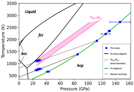 The phase diagram of Fe has been studied extensively as a function of pressure and temperature and is of particular importance for Earth and planetary science as well as for industry. It shows transitions between the bcc or fcc structures transforming to a hexagonal close-packed (hcp) structure at high pressure, (e.g., [12,13,14,15]). Some reports include investigations on the Fe-Ni binary system, demonstrating that the fcc–hcp boundary is shifted toward higher pressure and lower temperature with respect to the pure Fe phase diagram. Here, the Ni stabilizes the fcc structure, showing that the Ni content could be crucial in stabilizing the two-phase region (fcc together with hcp) at extreme conditions [16].