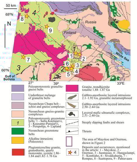 Deposits and occurrences in the Russian part of the Salla-Kuolajarvi belt are not classified unequivocally. The Mayskoe deposit was considered as an orogenic deposit in [14]. However, geochronological data show that the mineralization formed ~200 million years later than regional metamorphism, and a study of fluid inclusions in quartz indicates a significant role of magmatic fluids in deposit formation [8,28]. These characteristics are in conflict with the orogenic genetic model for the Mayskoe.
