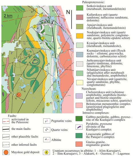 A series of albitite occurrences with uranium mineralization is located at the eastern flank of the Salla-Kuolajarvi belt (Figure 2), and some of these occurrences contain Au, Se, Te, Mo, and Re mineralization. Albitite forms zonal lenses up to 10 m thick and 10–90 m long, and the albitite lenses cross general strike of the wall rocks. Albitites may be hosted by different metasedimentary, metavolcanic, or intrusive rocks (Figure 2).