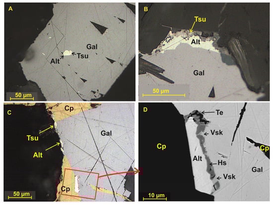 Tellurides from the Mayskoe deposit. (A–C)Polished sections’ photos, plane polarized light, (D) back-scattered electron image (BSE). Alt—altaite, Cp—chalcopyrite, Gal—galena, Hs—hessite, Te—native tellurium, Tsu—tsumoite, Vsk—volynskite.