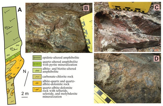 (A) Trench bed logging in the Ozernoe occurrence [5], (B,C) dolomite-quartz veinlets in albitite, (C) a veinlet with rich Te-Se mineralization, and (D) molybdenite (gray) mineralization in albitite.