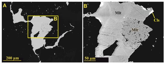 Block structure in melonite. The melonite is replaced by clausthalite in the outer part of the grain. BSE images. (A) general view, (B) detailed area. Cls—clausthalite, Mlt—melonite.