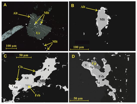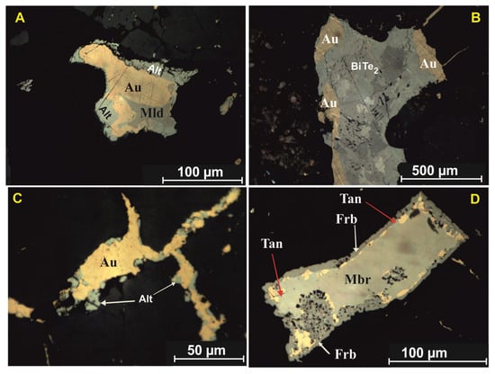 Telluride mineralization in the Rompas deposit, adapted after [4]. (A) Maldonite and altaite replace native gold, (B) native gold in the outer part of unnamed Bi-Te mineral phase, (C) replacement of gold by altaite, (D) zonal multimineral grain of montbrayite, tellurantimony, native gold, and frohbergite. Polished sections’ photos, plane polarized light. Alt—altaite, Au—native gold, Frb—frohbergite, Mbr—montbrayite, Mld—maldonite, Tan—tellurantimony.