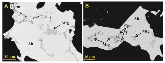 Mattagamite (A) and mattagamite-cobaltian pentlandite (B) inclusions in altaite. BSE images. Alt—altaite, Cpn—cobaltian pentlandite, Mtg—mattagamite.