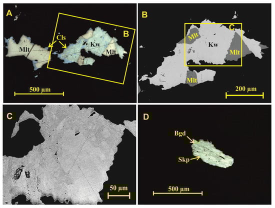 Kawazulite and skippenite in the Ozernoe occurrence. (A–C) Block structure in the kawazulite grain, (D) an aggregate of skippenite and bohdanowiczite. (A,D) Polished sections’ photos, plane polarized light, (B,C) BSE images. Bhd—bohdanowiczite, Cls—clausthalite, Kw—kawazulite, Mlt—melonite, Skp—skippenite.