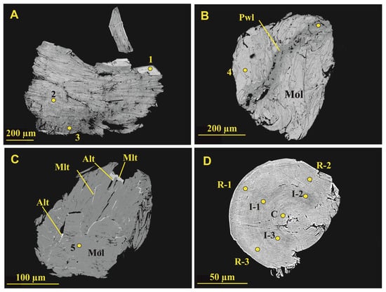 Molybdenite from the Ozernoe (A,B,D) and Alakurti (C) occurrences, with points of microprobe analysis (see Table 3). (A) Se-rich molybdenite in the outer part of the grain, (B) replacement of molybdenite by powellite, (C) melonite and altaite along cleavage cracks in molybdenite, and (D) a spherulite of molybdenite. BSE images. Alt—altaite, Mlt—melonite, Mol—molybdenite, Pwl—powellite.
