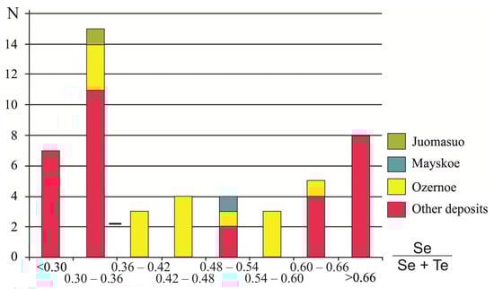Selenium and tellurium minerals were detected in Northern Fennoscandia in gold-only deposits (Mayskoe, Pahtavaara), gold deposit with uranium mineralization (Saattopora, Juomasuo, Konttiaho, Hangaslampi, Sivakkaharju, Rompas), and in uranium occurrences with gold (Ozernoe) (Table 4). Pahtavaara, Juomasuo, Sivakkaharju, Mayskoe, and Ozernoe contain both tellurium and selenium mineralization, while other deposits contain only tellurides.