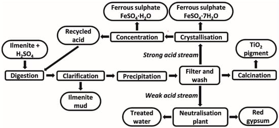 Currently, about 93–95% of the titanium ore extracted in the world is treated to generate titanium dioxide pigments []. There are two industrial processes to obtain TiO2 pigments, chloride (~60% of the world production) and sulphate (~40% of the total) routes [,]. In this case, the most interesting process is the sulphate route because some sulphates minerals are generated as by-products. In this work, an industry devoted to the titanium dioxide pigments manufacture (sulphate route) located 10 km from the city of Huelva, Spain, was studied (Tioxide Europe S.L.). In addition, we analysed the evolution over time, and the adaptation to the legislative changes carried out in order to minimise the environmental impact of the industrial process by implementing a wide recycling strategy.