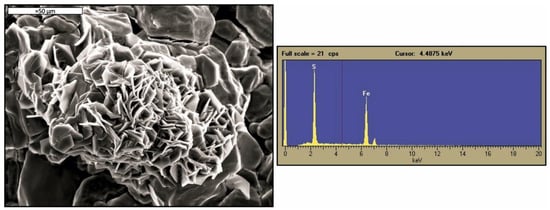 The SEM-EDX analyses of copperas produced at Huelva are shown in Figure 2. In the SEM images, a granular habit and size greater than 500 µm can be observed (left image). Furthermore, pseudohexagonal iron sulphate crystal aggregates with the “rosette” texture were identified (right image). Moreover, the elemental analysis of the surface was also obtained using Energy Dispersive X-ray spectroscopy (EDX). The study revealed the presence of Fe and S, as was expected from the previous XRF results.