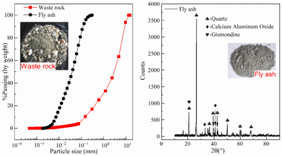 The physicochemical properties of the materials were analyzed, and the results of the main chemical compositions can be seen in Table 1. The density of the waste rock is 2.87 g/cm3, the specific weight in loose packing is 1.59 g/cm3, the porosity is 40.1%, and the mud content is 15.05%. In comparison, the density of the fly ash is 2.20 g/cm3, the specific weight in loose packing is 0.74 g/cm3, and the porosity is 59.7%.