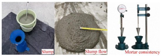 The mechanical meaning of slump (S) is the amount of deformation caused by the internal resistance when the slurry loses its external force and begins to flow under the action of self-weight [16]. It is generally accepted that the slurry can be gravity-fed when the slump is 23–27 cm [17,18]. A slump test was performed in accordance with the American Society for Testing Materials (ASTM) Standard C143. The slump flow (SF) is a corresponding index to the slump. The slump cannot reflect the accurate state when S > 23 cm, so the average diameter of the slump collapse is used as a substitution, i.e., the slump flow. The slump flow is measured with a tape (see Figure 2). The test for each specimen was repeated twice to ensure the repeatability of the results, and the mean value was used.