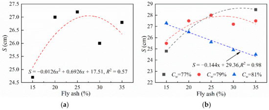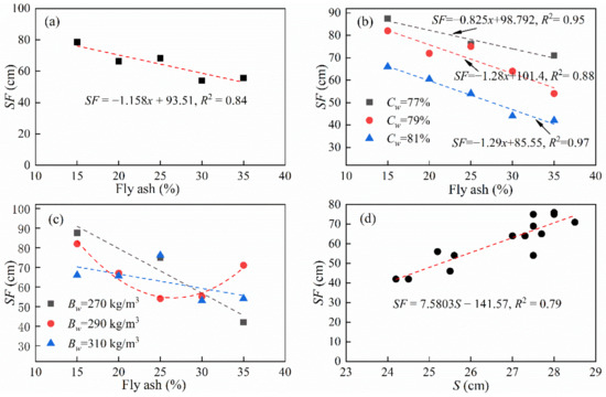 For different binder contents, as shown in Figure 4c, the quantitative relations are not obvious. The effect of the binder content on the slump flow is relatively smaller than those of the fly ash proportion and concentration. However, the slump and slump flow are mutually reinforcing. A fitting line is provided when the slump is >23 cm, as shown in Figure 4d, and the relation is illustrated in Equation (2)