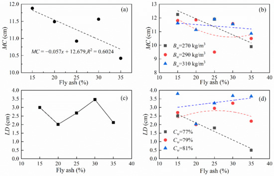 Variation in the mortar consistency and layering degree: (a) average MC vs. fly ash content; (b) MC at varying concentrations vs. fly ash content; (c) average LD vs. fly ash content; (d) LD at varying concentrations vs. fly ash content.