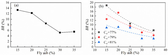 Relations between the BR and the fly ash content: (a) average BR; (b) BR at varying concentrations.