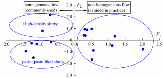 The principal component analysis method was applied to simplify and explain the use of flow properties. In this case, two new indices, F1 and F2 are deduced, which can be used to identify the slurry category: slurries with F1 > 0 are easy to delaminate and should be avoided in practice, whereas F1 < 0 indicates a homogeneous flow (or quasi-homogeneous flow). In detail, F1 < 0 and F2 > 0 indicates a high-density slurry, and F1 < 0 and F2 < 0 indicates a paste (paste-like) slurry, both of which are commonly used in practice.