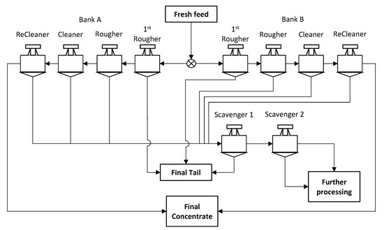 Figure 6a suggests that the residence time in the mainline (where mainline refers to the roughers, cleaners, and recleaners) is around 38 min and 45 min for bank A and B, respectively. A long residence time within the mainline is beneficial for quartz recovery, which is an important driver, but it is also results in more hematite losses to the froth. It can be seen from