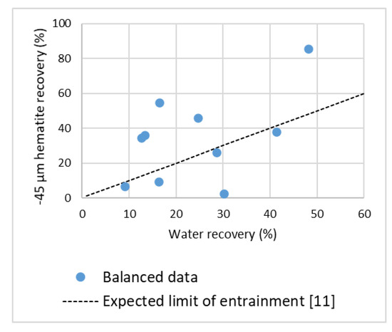 11]. Due to the classification of solids with respect to water in both the pulp and froth phases, this relationship is expected to be less than 1:1, the slope being related to the entrainability (ENT) factor. For the measured −45 µm hematite recovery, this relationship was not observed, and many of the experimental points showed hematite mass recovery being higher than that of water as shown in