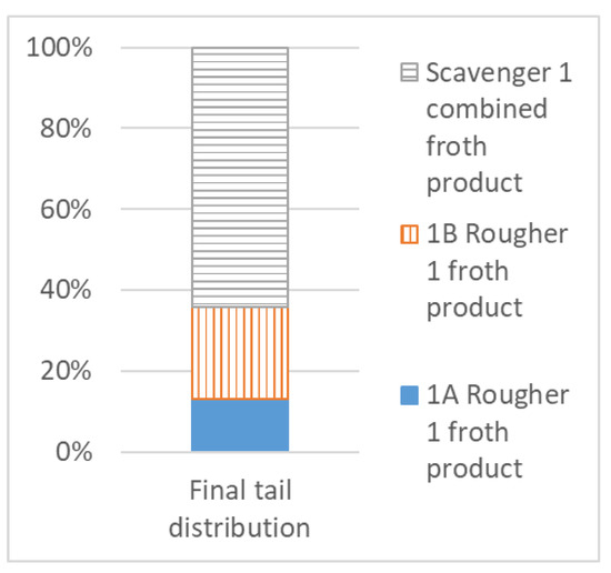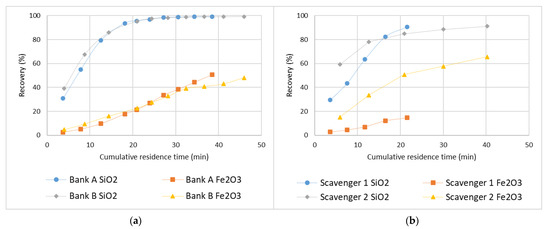 Figure 6b highlights that the residence time of scavenger 2 is nearly twice that of scavenger 1 (21 min compared to 40 min). The short residence time within scavenger 1 is beneficial as it allows the process to exploit the floatability differences of quartz and hematite. Scavenger 1 recovers nearly 90% of the quartz fed to it which leaves a small fraction of quartz left to be recovered by scavenger 2, even though, it has a much longer residence time. The benefit of the short residence time in scavenger 1 can be seen as this bank only recovers 15% of the hematite fed to it whereas scavenger 2 recovers nearly 60%. As mentioned previously, residence time is an important parameter that should be used to exploit the relative differences in the kinetics of quartz and hematite, and this carries through to the scavenger circuit. The relatively short residence time of scavenger 1 still recovers most of the quartz (90%) while minimizing hematite losses to only 15%.