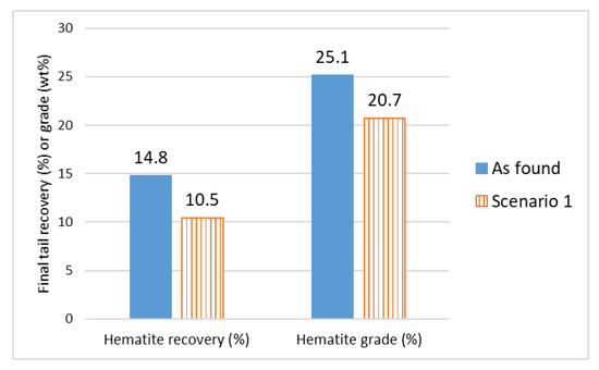 Figure 7 indicates that, by rerouting the rougher 1 tail of both bank A and B to the feed of the scavengers, a significant decrease in hematite losses to the final tail can be realized. The recovery of hematite to the final tail decreases from 14.8% to 10.5% indicating a recovery gain of around 4%. This is further illustrated by the drop of hematite grade within the final tail by nearly 4.5 wt%. It should be noted that this does decrease the scavenger 1 residence time, and therefore, the quartz recovery in this bank drops from 84% to 79%. However, the excess residence time available in scavenger 2 will ensure that the quartz recovery over both scavenger banks remains constant.