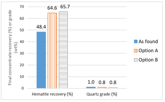 In the current circuit configuration, the scavenger 2 concentrate forms part of the feed to a subsequent concentrating step. The long residence time of the scavenger 2 bank has been mentioned a few times; however, due to this, it produces a concentrate containing 98.6 wt% hematite and 1.0 wt% quartz (virtually the final concentrate quality). This leads to the scenario 2 simulation which has an option A and B. Option A reroutes the scavenger 2 concentrate to a final concentrate because the chemical analysis indicated that no further processing is needed. Option B reroutes the scavenger 2 concentrate to the feed of the mainline to address the residence time concerns in the mainline highlighted previously. The results of these simulations are shown in